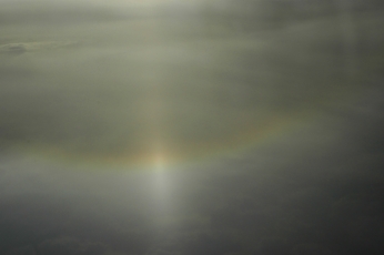 When flying into Manchester Airport last week on my way to the Sheffield LUG Seminar I noticed a rainbow coloured circle (actually, only a part of a circle) around the sun. I think it's part of a 22° circular halo although I'm not sure. You can clearly see that it's darker inside the "circle". What is also unknown is why there is this bright white ray directly between the Sun and the Earth (the image is a bit rotated, so that's why it's not straight down).