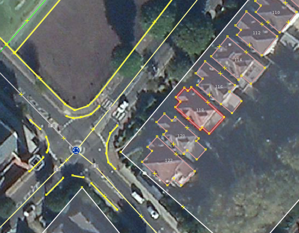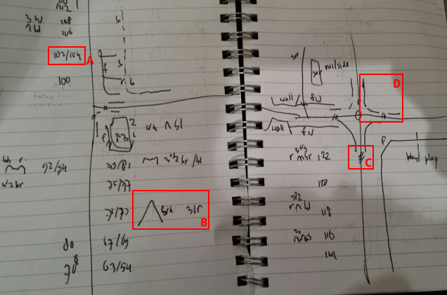 Over the past few years I have developed a short hand for all kinds of things. You can see house numbers (a), how many floors, the colour of the building, the shape and colour of the roof (b), crossings (c) and fences (d) on the extract above.