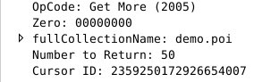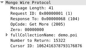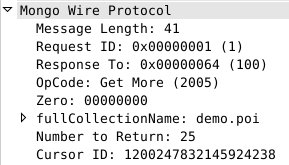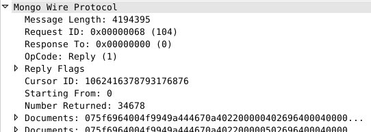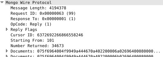 When the driver asks for more documents separately (i.e., not at the same time it is issuing a query) without a specific batch size, the server fills up 4MB of documents. On the wire, the request for Get More looks like: