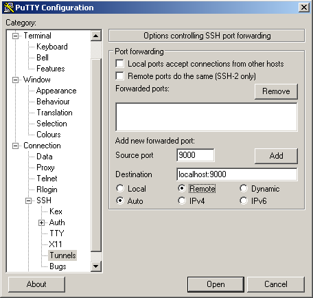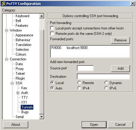 Don't forget to go back to the Session tab and press save. You're now ready to login and when you do so an SSH tunnel will be created just like in the Unix case above.
