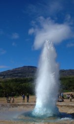 The English word geysir finds its origin in exactly the site which formerly housed this great natural water fountain in Iceland. However, in the last few years the original geysir does no longer function properly and only rarely spits out its water into the air. However at the same site there is another geysir called Strokkur which still performs well. About every 5 to 10 minutes it bursts out water into the air, however each bursts intensity varies quite a bit. You need to be a bit lucky to see a "big one". Besides Strokkur there are also a number of smaller less regular geysirs and "Bluesi" - a very blue pool with warm water.