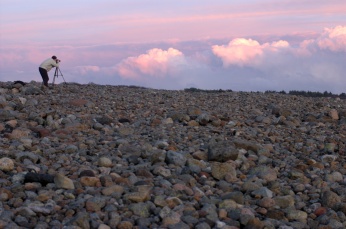 I usually try to get out in the weekend a bit instead of staying inside the house. The weather was great yesterday so I invited Sebastian for a little trip to MΓΈlen to take pictures at sunset. Unfortunately, we were two minutes too late to see the sun set. Luckily that did not stop us from taking pictures - just after sunset there is still some sunlight that hits the clouds turning them red. Here you see Sebastian taking a picture of just those red clouds: