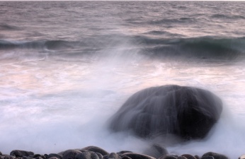 If you instead of a close up take a bit wider image of the shore it gives an eery feeling just like this shot of the waves and water flowing inbetween the rocks that were deposited here by a glacier a long time ago:
