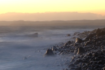 After the sun sets the light decreases which allows you to play a little bit with longer exposures. You can get very nice effects such as in this four second exposure of waves breaking on the (rocky) shore: