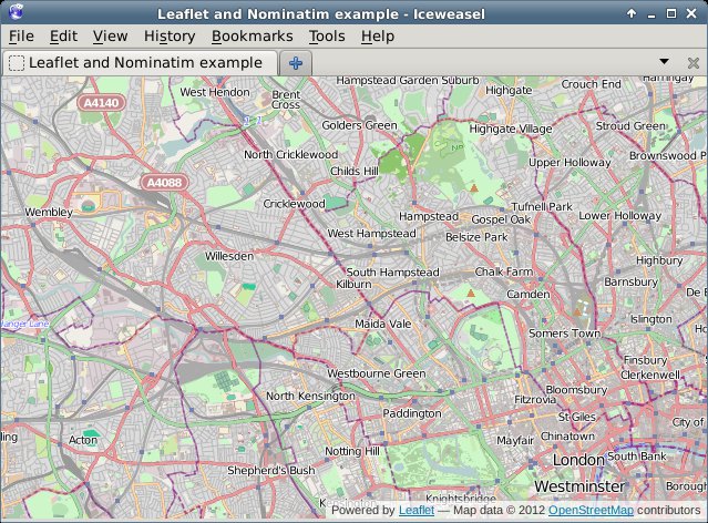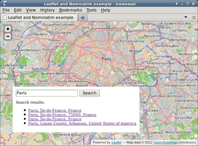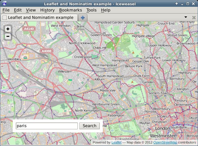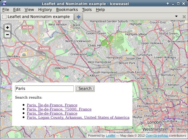 The code for this example is available on github in my osm-tools repository at https://github.com/derickr/osm-tools/tree/master/leaflet-nominatim-example