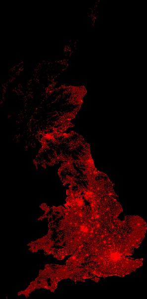About a month ago, Ordnance Survey opened up some of their data for public consumption under a brand called OpenData. The data is licenced under a "Creative Commons Attribute"-like license. One of the data sets they provide is Code-Point Open and provides a dataset "that contains postcode units, each of which have a precise geographical location". I've always been a bit of a map-geek, and have always geotagged my pictures and some of my tweets. So I was wondering what cool thing I could do with this newly released data. I decided to map all the postcodes onto the UK map where more postcodes for a specific place would create a "lighter" colour. Each postcode has on average about 15 addresses, so in more densely populated areas you have more "postcodes-per-area". Doing this wasn't very difficult and it resulted in the following map: