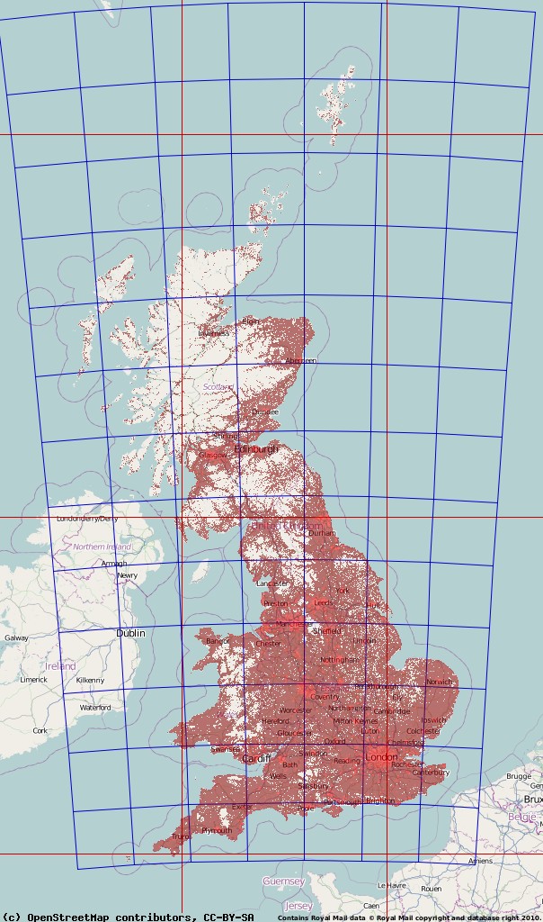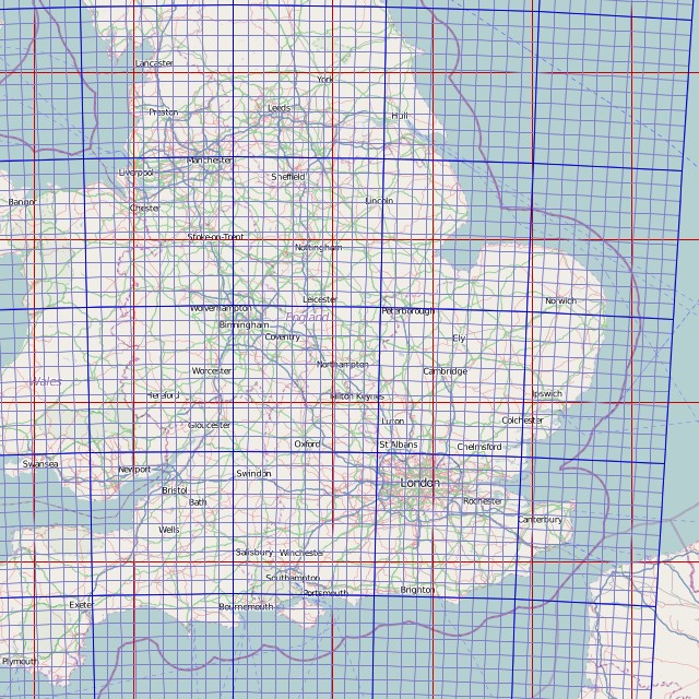 Creating an image for the whole world at zoom level 13 is impractical as it is 2097152*2097152 pixels and downloading all the 67 million tiles for this zoom level is probably not liked by the OSM people either. So instead we take a cut out for a specific area only. For the UK (61.37°N -9.49° W, 49.76°N +3.63°E) at zoom level 7 we end up with a 1536x2048 map with the North-Western pixel being 15360,9216. On this map, we can draw the latitudes and longitudes as well as the National Grid lines (full image is on flickr):