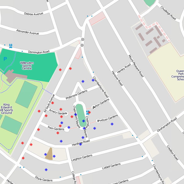 As you can see, this is perfect fit to the outlines of the country. But unfortunately, when we look very closely at the plotted map data, for example for the NW10 3 postcodes, we notice that the mapping is slightly off. The blue dots are what we plotted, and the red dots are what the locations should have been: