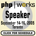 In two weeks I will be heading to Toronto to speak at php|works . I will speak on several things, perhaps the most surprising one is The PHP Toolbox , where I will actually be talking on PEAR partly when introducing how to set up your own managable PHP Toolbox. Less surprising talks are PHP and Unicode that discusses the new Unicode features in PHP 6, and How PHP Ticks that goes into some of the inner workings of PHP. With this talk I hope to be creating some awareness of PHP's design limitations and features so that people can better utilize PHP.