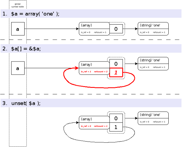 Explaining how the full algorithm works goes slightly too far for this column, but I will try to explain the basics. First of all we have to establish a few ground rules. If a refcount is increased, it's still in use and therefore not garbage. If the refcount is decreased and hits zero, the zval can be freed. This means that garbage cycles can only be created when a refcount argument is decreased to a non-zero value. Secondly, in a garbage cycle it is possible to discover which parts are garbage by checking whether it is possible to decrease their refcount by one, and then check which of the zvals have a refcount of zero.