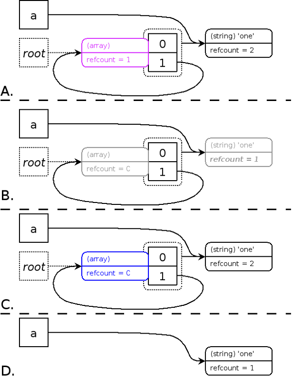 In step B runs the algorithm a depth-first search on all possible roots to decrease the refcounts of each zval it finds by one, making sure not to decrease a refcount on the same zval twice (marking them as "grey"). In step C the algorithm runs again a depth-first search from each root node, to check the refcount of each zval again. If it finds that the refcount is zero, the zval is marked "white" (blue in the diagram). If it's larger than zero, it reverts the decreasing of the refcount by one with a depth-first search from that point on and they are marked "black" again. In the last step (D) the algorithm walks over the root buffer removing the zval roots from there, and in the mean while checks which zvals have been marked "white" in the previous step. Every zval marked as "white" will be freed.