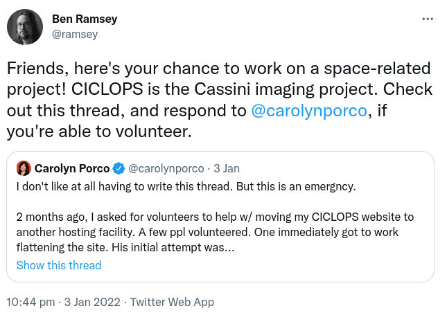 At the beginning of the year, I saw a tweet by my friend Ben Ramsey, where he quoted Carolyn Porco's tweet requesting help saving CICLOPS, the web site of the Cassini Imaging Central Laboratory for Operations, which was under threat of disappearing off the internet.