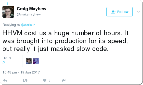 At the start of 2015 we began work on an HHVM driver for MongoDB, as part of our project to renew our PHP driver. Back then, HHVM was in its ascendancy and outperforming PHP 5.6 two to one. With such a huge performance difference it was reasonable to assume that many users would be switching over.