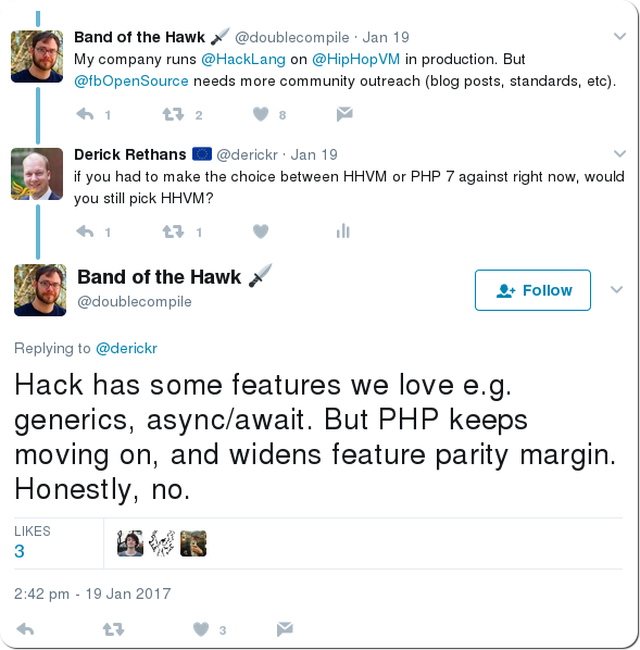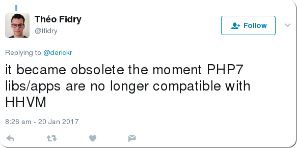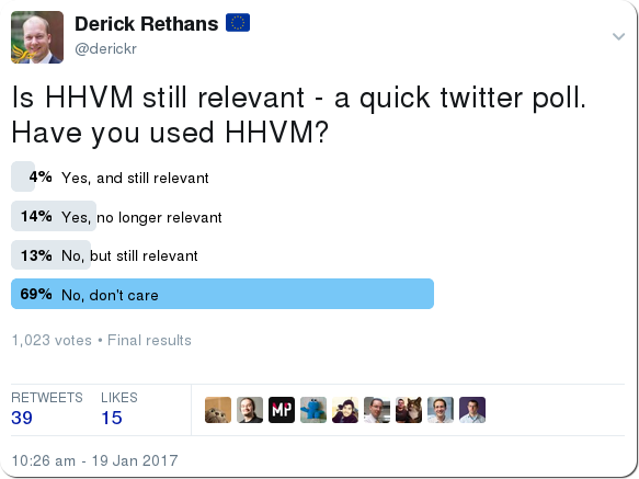 With PHP 7 released, we saw very little use of the HHVM driver for MongoDB. Some months ago I did a twitter poll, where very few people were indicating that they were using HHVMβand even if they were, they would likely not choose to switch to HHVM given the current climate.