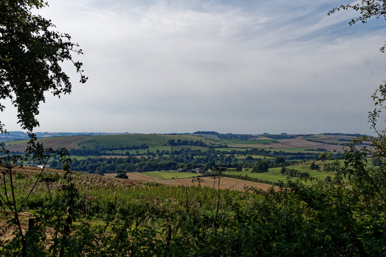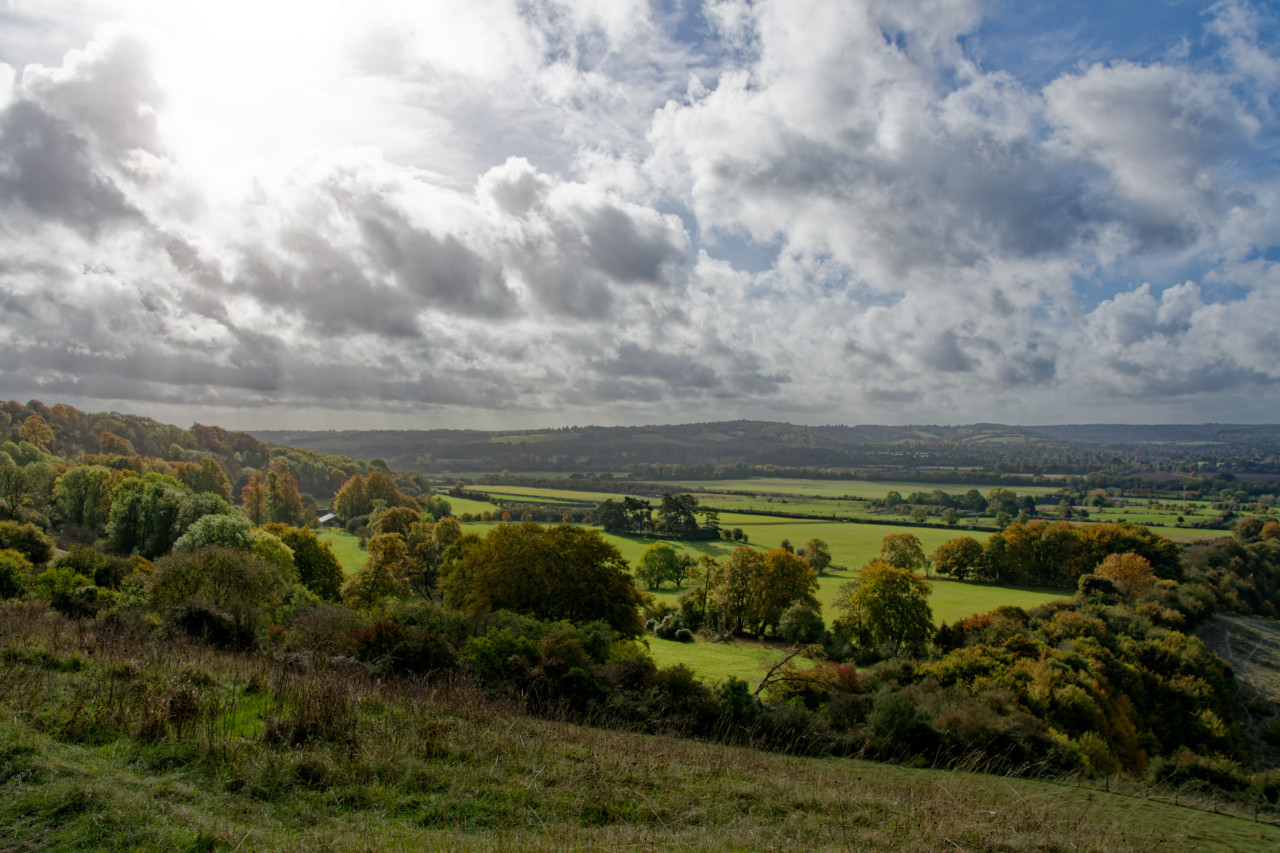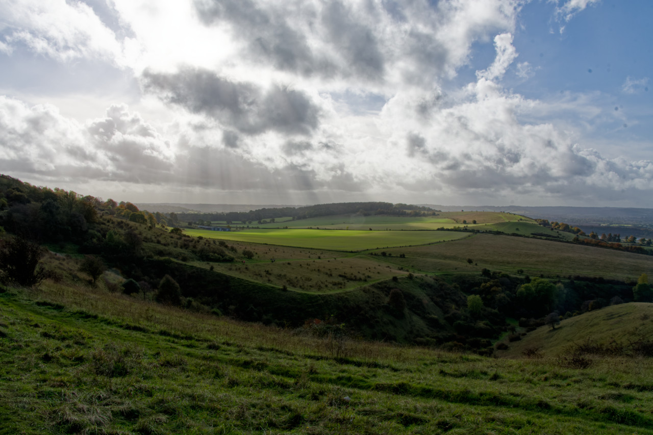 After crossing and following a quiet road, I ended up on the slopes of Coombe Hill. The clouds were getting sparser, which created interesting patterns on the fields in the valley below.