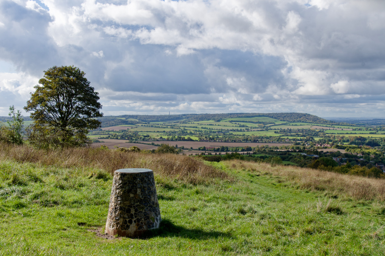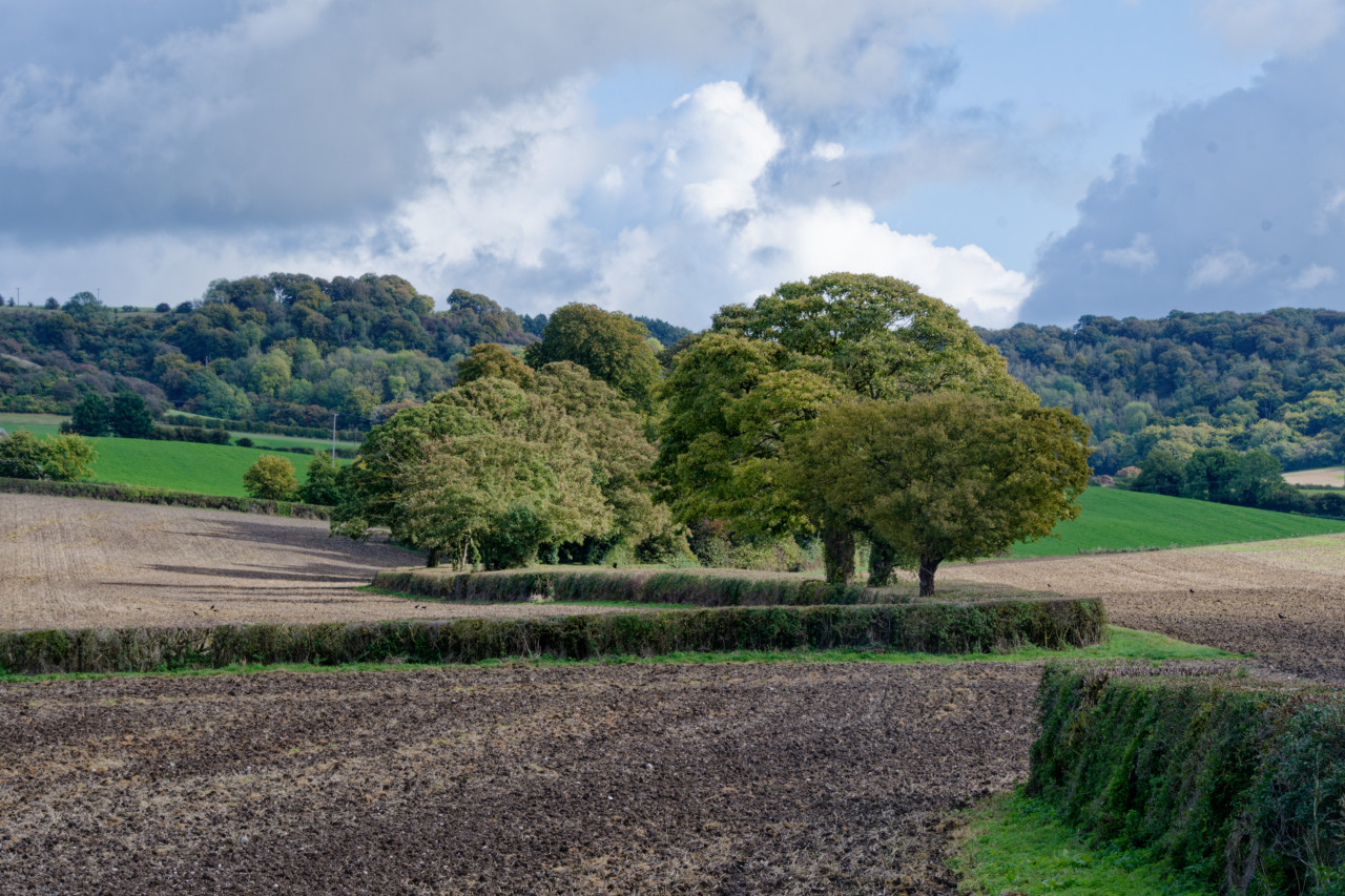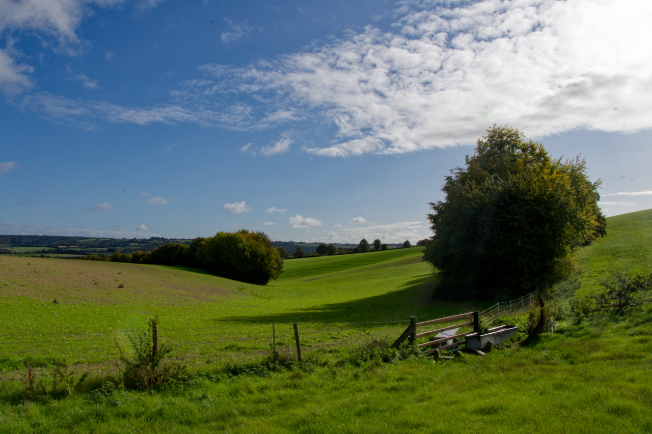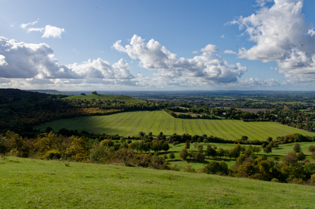 After crossing and following a quiet road, I ended up on the slopes of Coombe Hill. The clouds were getting sparser, which created interesting patterns on the fields in the valley below.