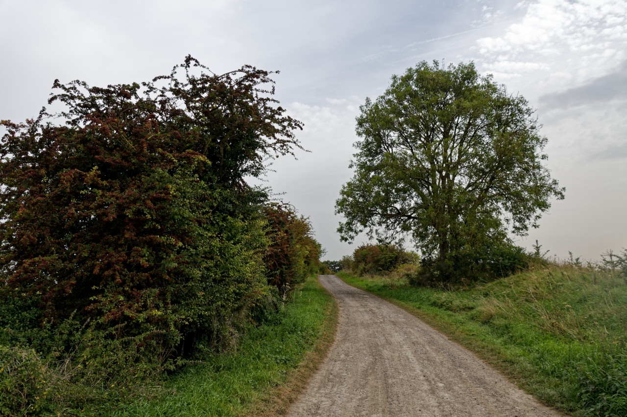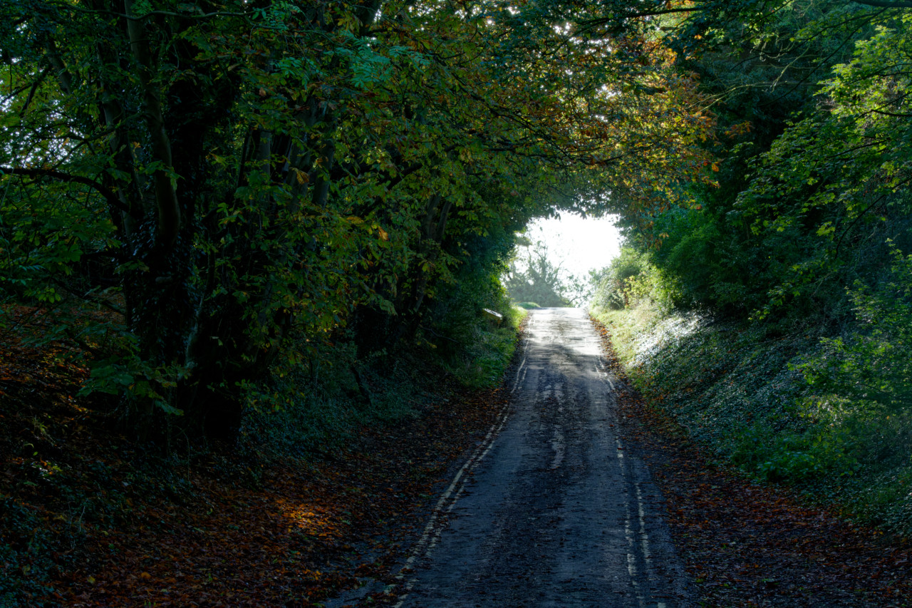 After arriving at Lewknor, I had to get up to Ridgeway level, which involved a steep climb along a narrow road lined with colourful trees, creating a tunnel effect. Once at the top, the low Sun blinded me as it reflected on the slightly wet road.