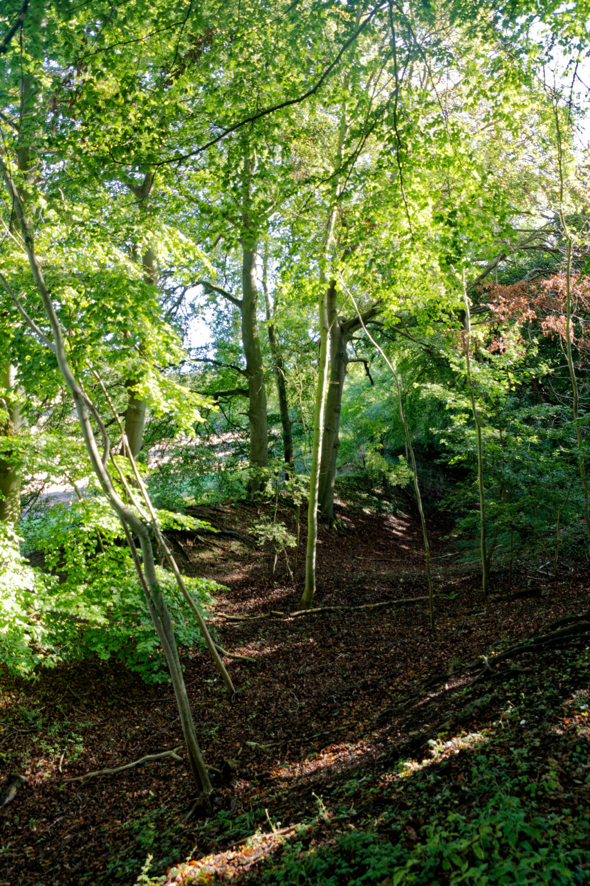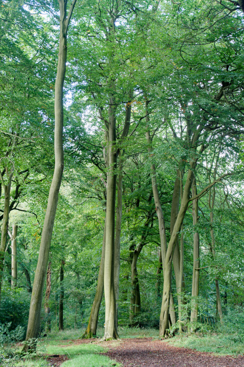 The short climb into Linton's Wood revealed a path through the leaves cut out by the rain, which reminded me of walking around in the forest where I grew up. I enjoyed some of the more exposed tree trunks, which had few leaves and were still remarkably green.