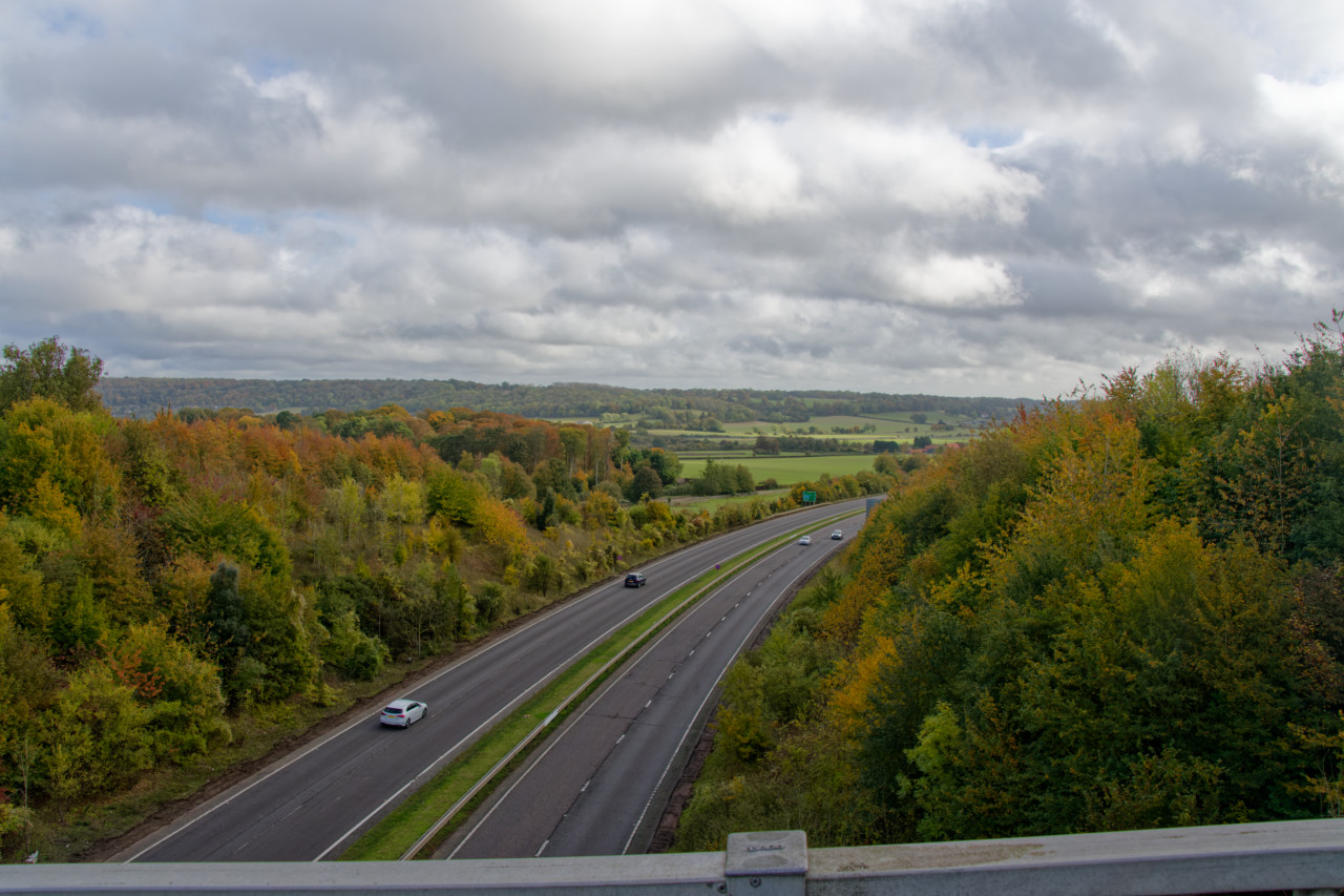 I am usually not keen on having my walk interrupted by a busy road, but the view from the high pedestrian bridge across the A41 was pretty good. Colourful trees flanked each side, with the finish of the Ridgeway in the distance.